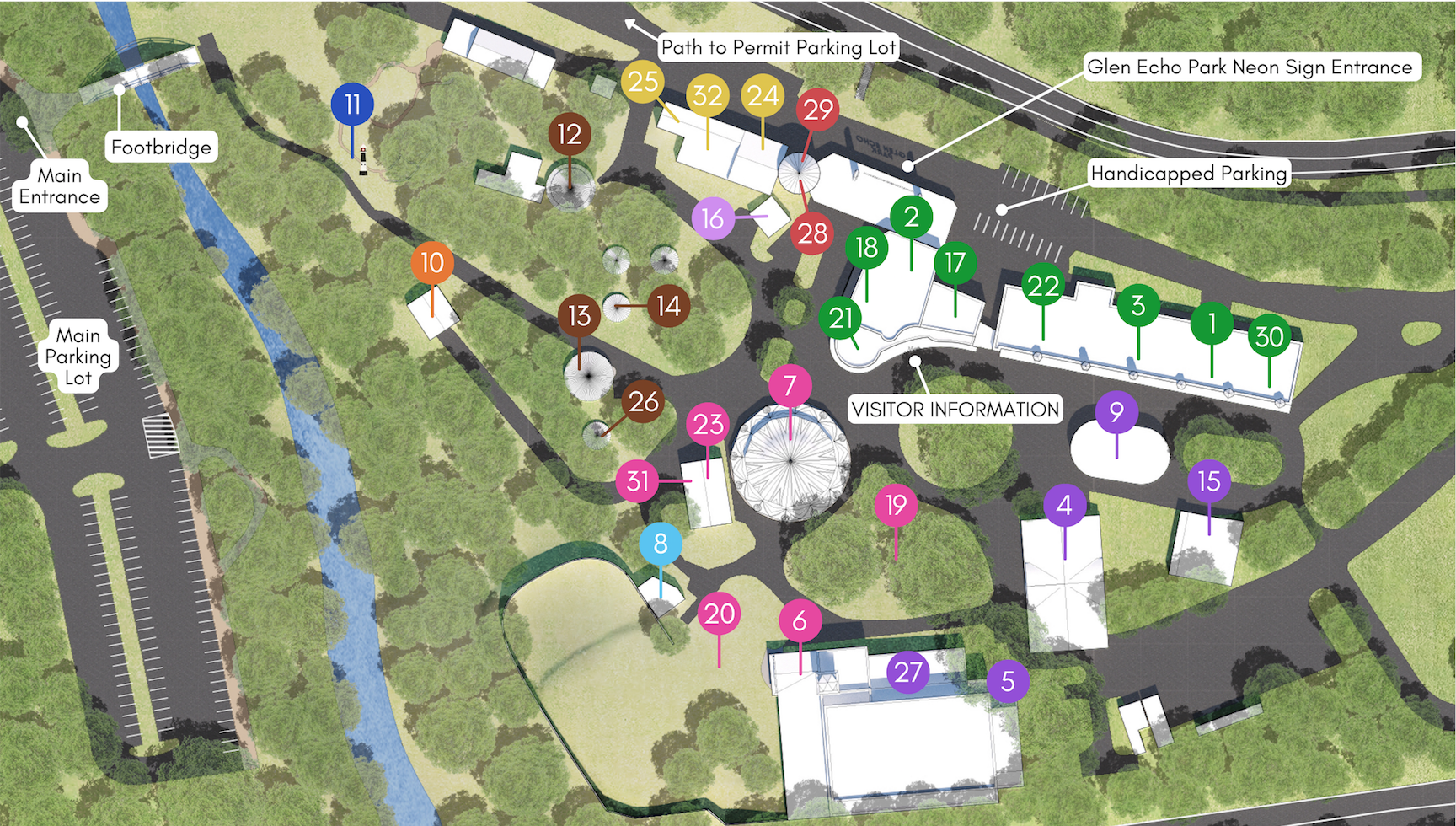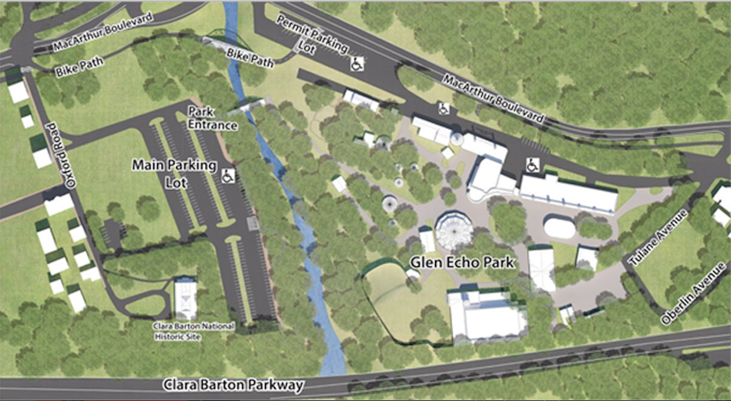 - Enter Glen Echo Park from the main entrance off MacArthur Blvd.
