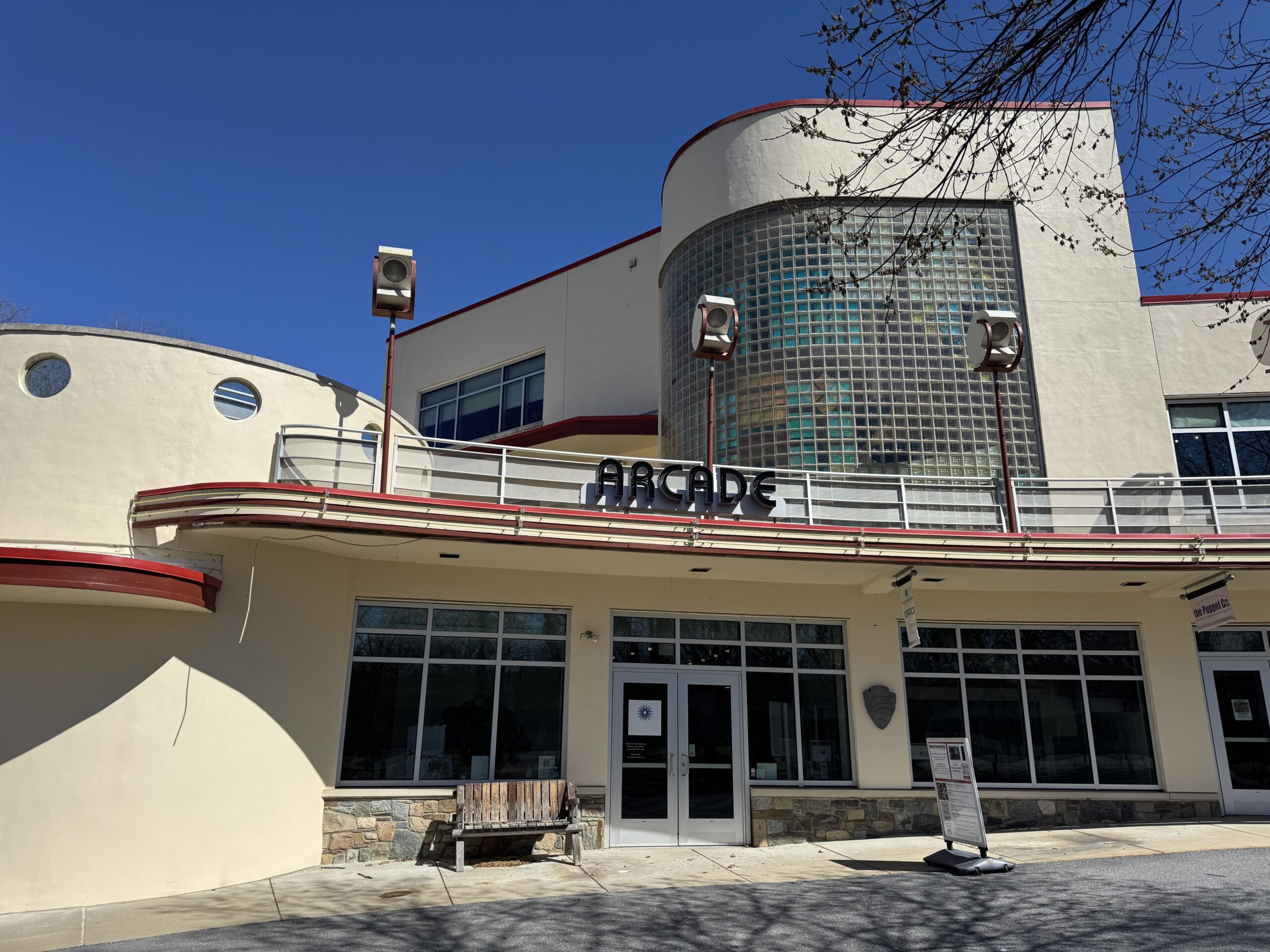 Permit Parking Lot at 7300 MacArthur Blvd, Glen Echo, MD 20812. Drive through the permit parking lot to reach the accessible spaces, which are located near the iconic Glen Echo Park neon sign.