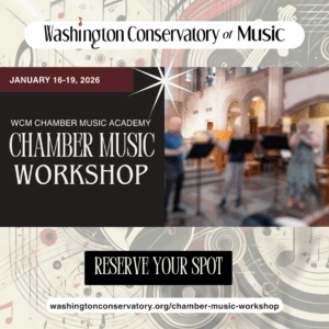 Join the Washington Conservatory of Music Chamber Music Academy— three weekend intensives designed for dedicated adult musicians to refine their ensemble skills, receive expert coaching, collaborate in an inspiring setting, and enjoy master classes and performances by distinguished faculty and guest artists. Each workshop culminates in a final performance, showcasing the progress and artistry developed throughout the workshop.