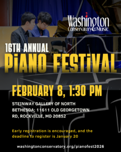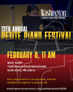 We proudly present outstanding live music to the community, with a donate-as-you-can policy to support WCM educational programs. Consider making a one-time or monthly gift to support our events and programs at the Washington Conservatory of Music.