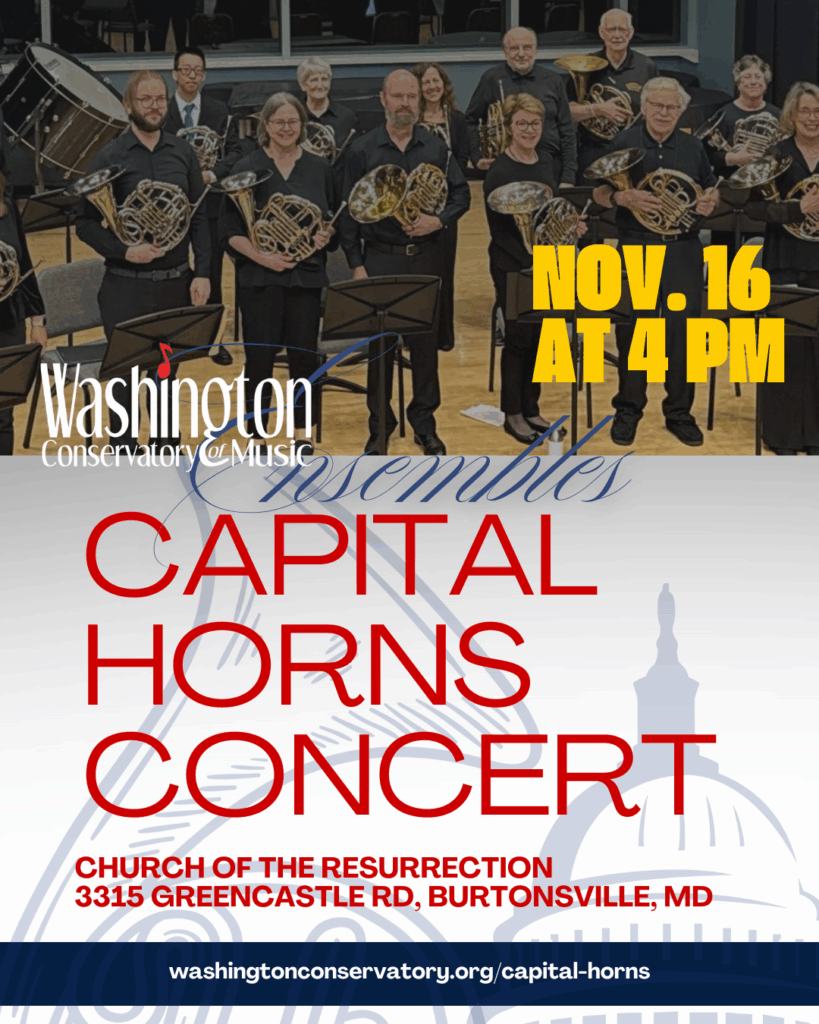 Join the Capital Horns of the Washington Conservatory of Music for an inspiring afternoon of brass harmony and community spirit. Under the direction of Jeff Bianchi, this vibrant French horn ensemble brings together players of all ages and skill levels from across the Washington, D.C. metropolitan area. Enjoy a rich program that celebrates the warmth, power, and beauty of the horn in both classic and contemporary works.