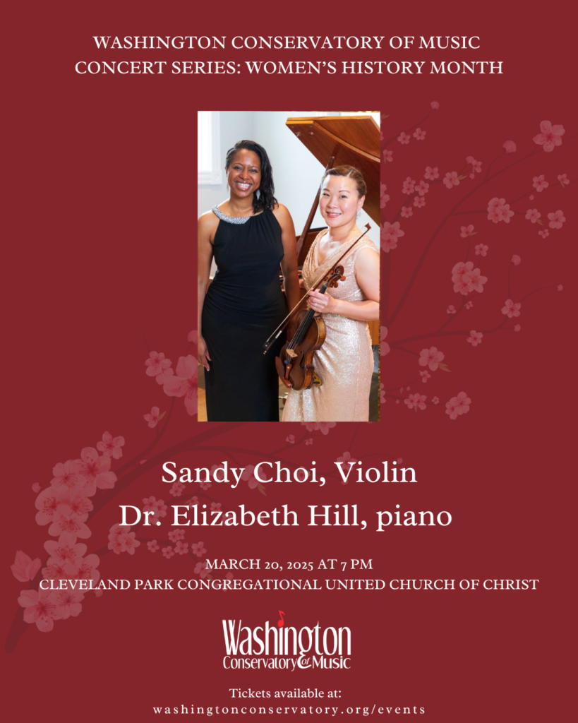 Celebrate Women’s History Month (and the beginning of cherry blossom season) with our concert series! This time, we feature the incredible violinist Sandy Choi and the amazing pianist Dr. Elizabeth Hill at Cleveland Park Congregational UCC. ⭐️ Following this recital will be a community potluck! Bring your favorite refreshments or finger foods that remind you of the strong women in your life. ⭐️ Let’s use this time to bond with our community and loved ones over food and music! We can’t wait to see you there. Suggested donation $20 payable online or at the door. Immerse yourself in a stunning performance that honors the artistry and contributions of women in music. Following the concert, join us for a community potluck, where you can connect with fellow music lovers and celebrate the power of music in bringing people together. Don’t miss this beautiful tribute to women in music—reserve your tickets today! 🎶✨