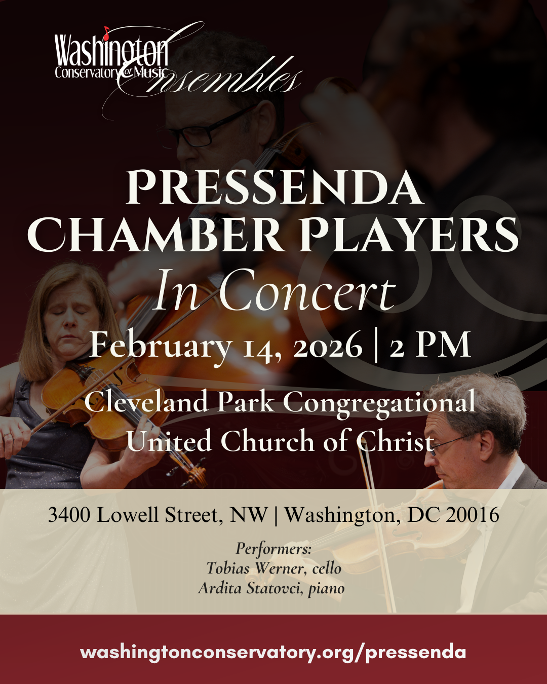 Make a Donation This concert brings together musicians participating in the Washington Conservatory’s Winter Chamber Music Weekend, an immersive program dedicated to learning, collaboration, artistry, and musical exploration. The performance highlights the depth of work developed during the weekend through ensemble rehearsals and coaching from WCM Faculty members. The program also features a special solo […]